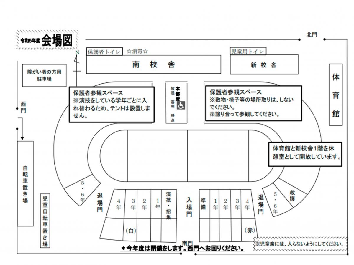〇 共用の参観スペースでの敷物や椅子等による場所取りはしないでください。各学年の演技ごとに、交代をしていただくようになります。保護者の皆様で譲り合ってご観覧ください。